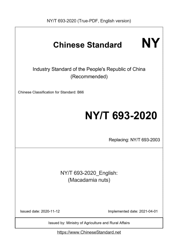 Delivery: <= 3 days. True-PDF full-copy in English will be manually translated and delivered via email. NY/T 693-2020: (Macadamia nuts) Status: Valid NY/T 693: Historical versions