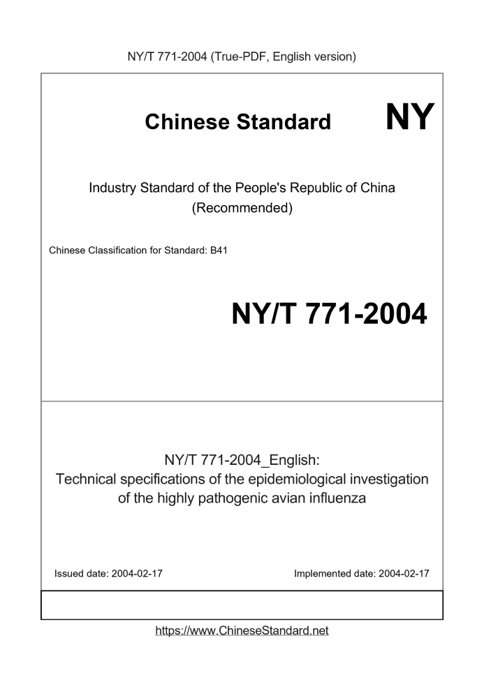 Delivery: <= 3 days. True-PDF full-copy in English will be manually translated and delivered via email. NY/T 771-2004: Technical specifications of the epidemiological investigation of the highly pathogenic avian influenza Status: Valid