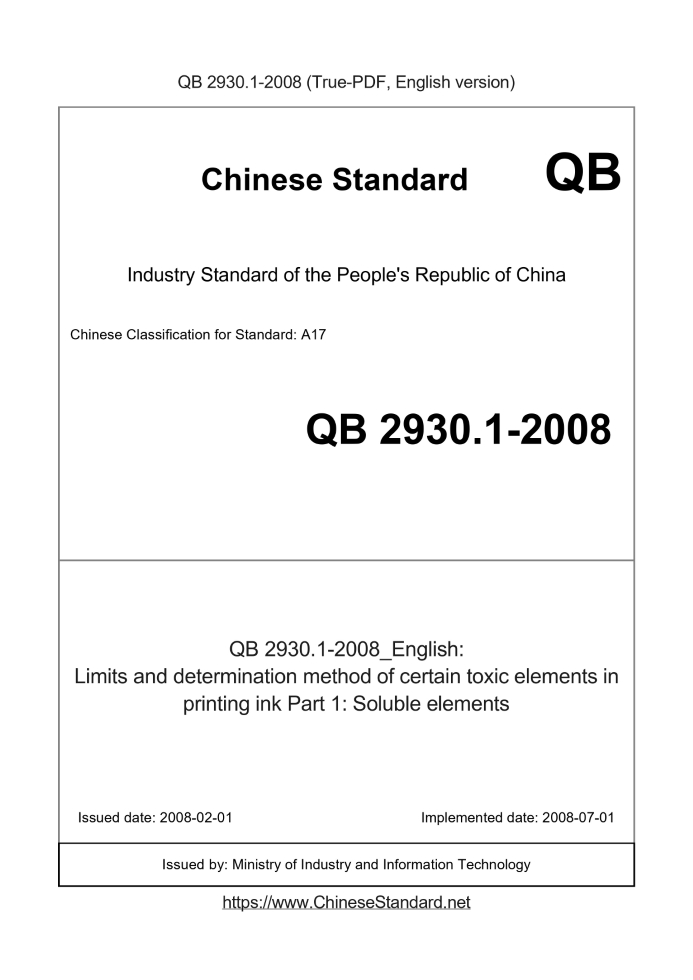 Basic dataStandard ID: QB 2930.1-2008 (QB2930.1-2008)Description (Translated English): Limits and determination method of certain toxic elements in printing ink Part 1: Soluble elements Sector / Industry: Light Industry Standard Classification of Chinese Standard: A17 Classification of International Standard: 87.080 Word Count Estimation: 10,182 Date of Issue: 2008-02-01 Date of Implementation: 2008-07-01 Quoted Standard: GB/T 6682 Regulation (derived from): ?Development and Reform Commission Announcement 2008 No.11 Issuing agency(ies): Ministry of Industry and Information Technology Summary: This standard specifies the ink soluble elements (antimony, arsenic, barium, cadmium, chromium, lead, mercury, selenium) maximum limit requirements. Sample preparation and measurement methods. This section applies to ink products, ink and printing products may also refer to the use. Tips & Frequently Asked Questions:Question 1: How long will the true-PDF of QB 2930.1-2008_English be delivered?Answer: Upon your order, we will start to translate QB 2930.1-2008_English as soon as possible, and keep you informed of the progress. The lead time is typically in 9 seconds (download/delivered in 9 seconds). The lengthier the document the longer the lead time.Question 2: Can I share the purchased PDF of QB 2930.1-2008_English with my colleagues?Answer: Yes. The purchased PDF of QB 2930.1-2008_English will be deemed to be sold to your employer/organization who actually pays for it, including your colleagues and your employer's intranet.Question 3: Does the price include tax/VAT?Answer: Yes. Our tax invoice, downloaded/delivered in 9 seconds, includes all tax/VAT and complies with 100+ countries' tax regulations (tax exempted in 100+ countries) -- See Avoidance of Double Taxation Agreements (DTAs): List of DTAs signed between Singapore and 100+ countriesQuestion 4: Do you accept my currency other than USD?Answer: Yes. If you need your currency to be printed on the invoice, please write an email to Sales@ChineseStandard.net. In 2 working-hours, we will create a special link for you to pay in any currencies. Otherwise, follow the normal steps: Add to Cart -- Checkout -- Select your currency to pay. |