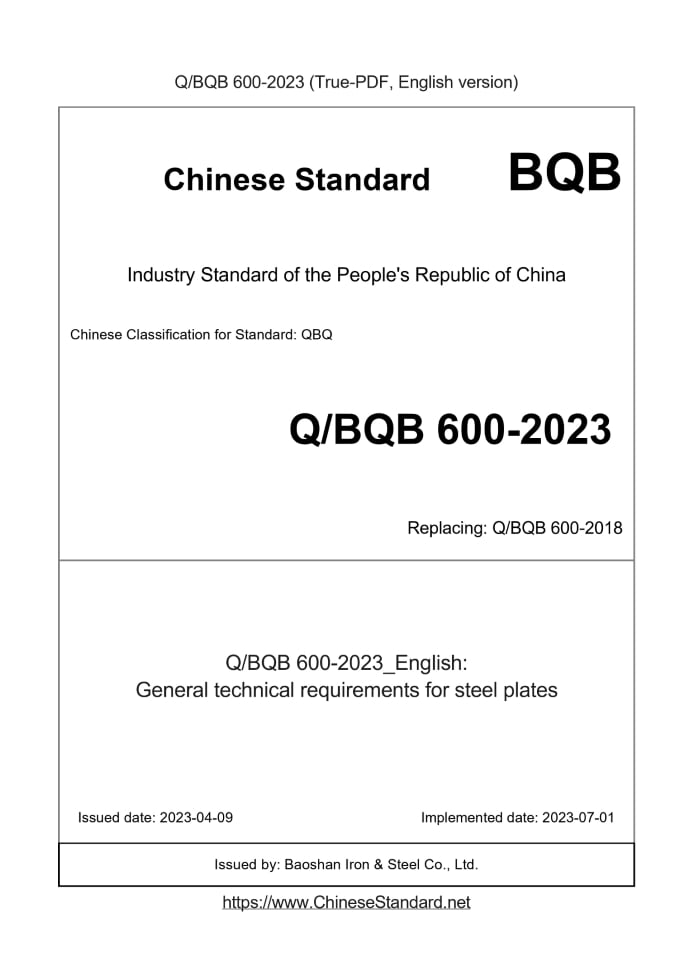 Delivery: <= 4 days. True-PDF full-copy in English will be manually translated and delivered via email. Q/BQB 600-2023: General technical requirements for steel plates Q/BQB 600: Historical versions