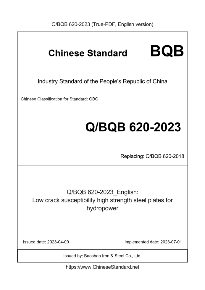 Delivery: <= 3 days. True-PDF full-copy in English will be manually translated and delivered via email. Q/BQB 620-2023: Low crack susceptibility high strength steel plates for hydropower Q/BQB 620: Historical versions