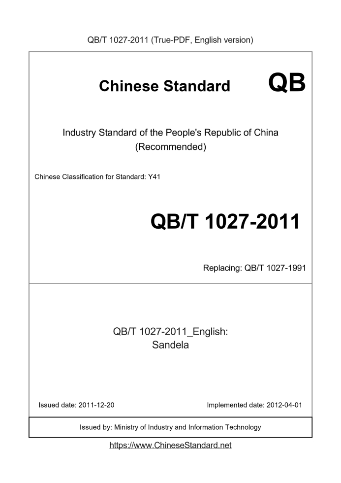 Delivery: <= 2 days. True-PDF full-copy in English will be manually translated and delivered via email. QB/T 1027-2011: Sandela Status: Valid QB/T 1027: Historical versions
