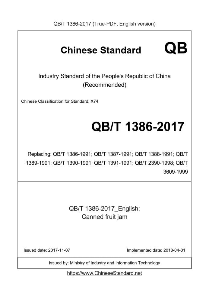 Delivery: <= 3 days. True-PDF full-copy in English will be manually translated and delivered via email. QB/T 1386-2017: Canned fruit jam Status: Valid QB/T 1386: Historical versions