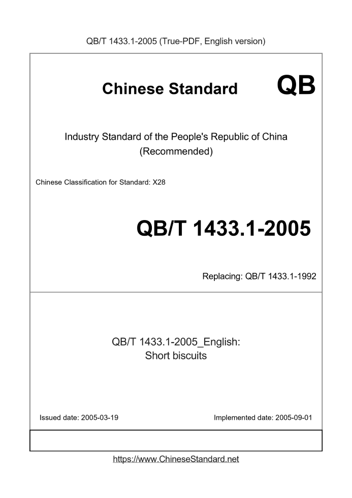 Delivery: <= 2 days. True-PDF full-copy in English will be manually translated and delivered via email. QB/T 1433.1-2005: Short biscuits Status: Obsolete QB/T 1433.1: Historical versions