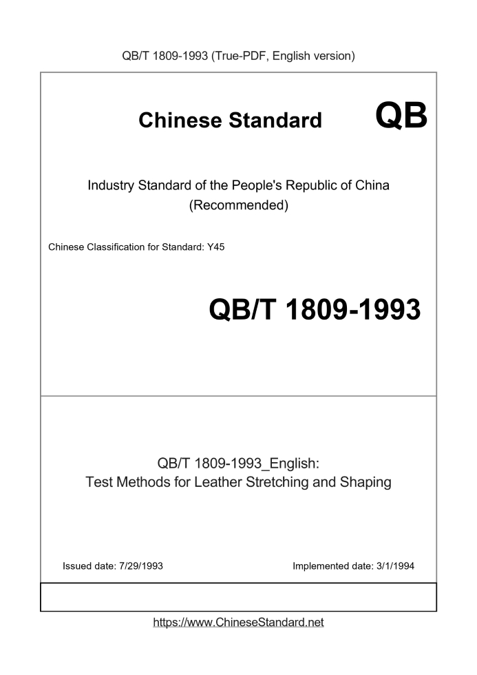 Delivery: <= 3 days. True-PDF full-copy in English will be manually translated and delivered via email. QB/T 1809-1993: Test Methods for Leather Stretching and Shaping