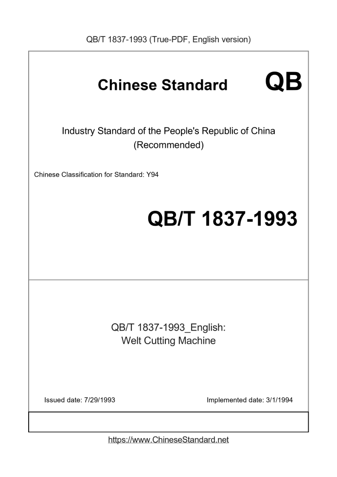 Delivery: <= 2 days. True-PDF full-copy in English will be manually translated and delivered via email. QB/T 1837-1993: Welt Cutting Machine