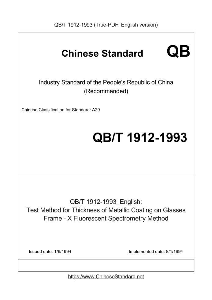 Delivery: <= 3 days. True-PDF full-copy in English will be manually translated and delivered via email. QB/T 1912-1993: Test Method for Thickness of Metallic Coating on Glasses Frame - X Fluorescent Spectrometry Method Status: Obsolete