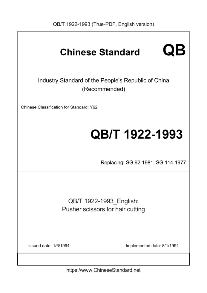 Delivery: <= 3 days. True-PDF full-copy in English will be manually translated and delivered via email. QB/T 1922-1993: Pusher scissors for hair cutting