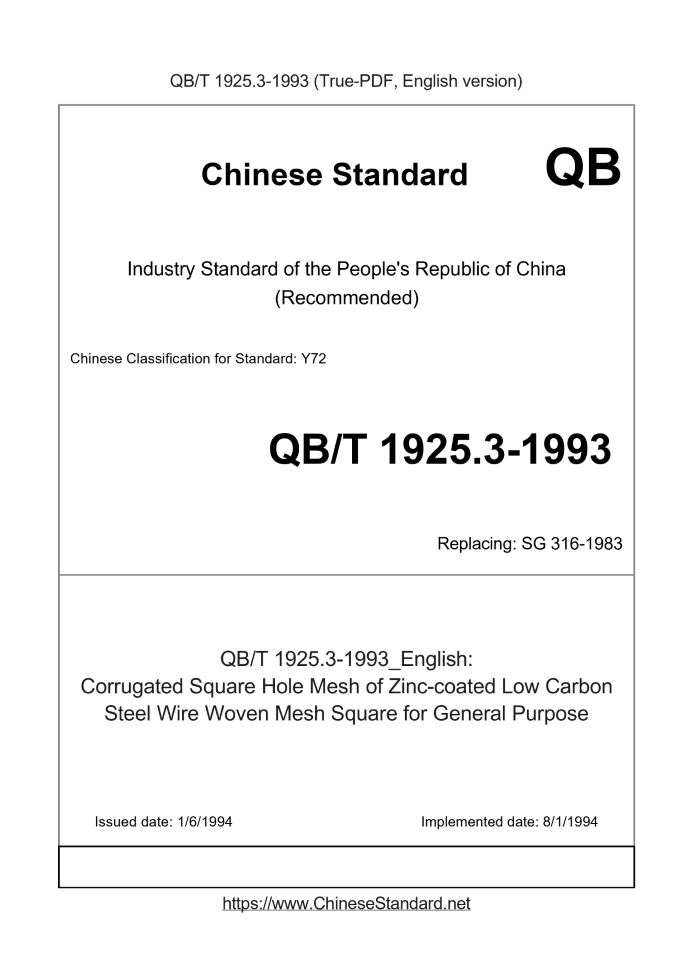 Delivery: <= 3 days. True-PDF full-copy in English will be manually translated and delivered via email. QB/T 1925.3-1993: Corrugated Square Hole Mesh of Zinc-coated Low Carbon Steel Wire Woven Mesh Square for General Purpose