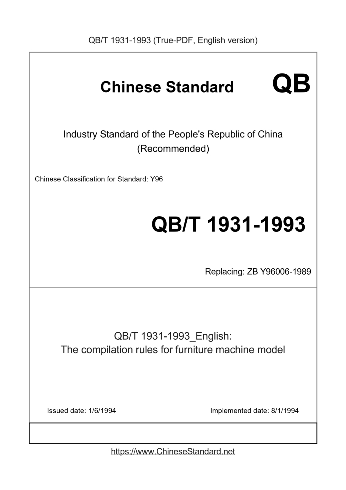 Delivery: <= 6 days. True-PDF full-copy in English will be manually translated and delivered via email. QB/T 1931-1993: The compilation rules for furniture machine model