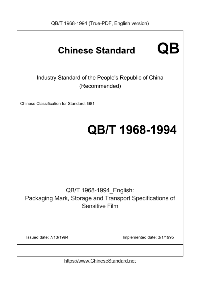 Delivery: <= 2 days. True-PDF full-copy in English will be manually translated and delivered via email. QB/T 1968-1994: Packaging Mark, Storage and Transport Specifications of Sensitive Film