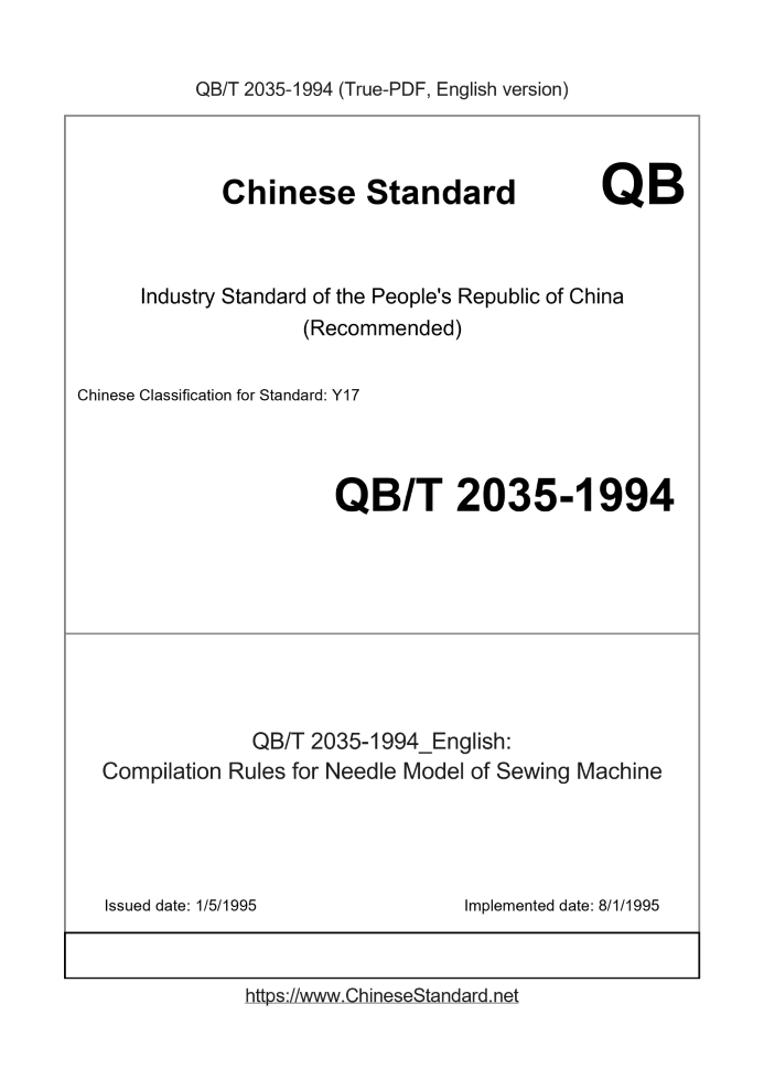 Delivery: <= 3 days. True-PDF full-copy in English will be manually translated and delivered via email. QB/T 2035-1994: Compilation Rules for Needle Model of Sewing Machine Status: Obsolete