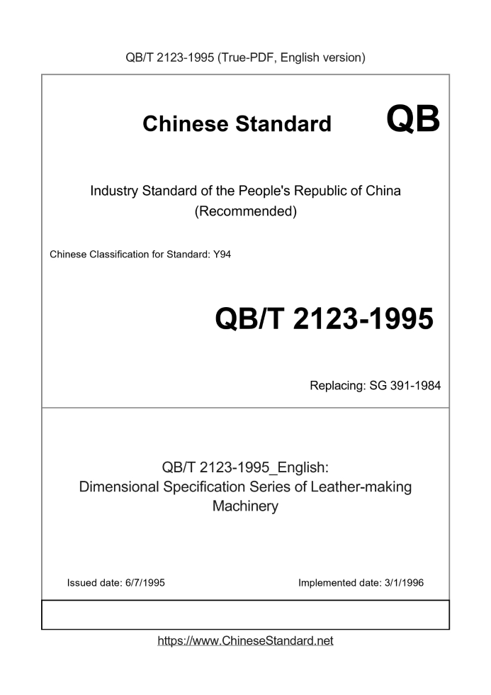 Delivery: <= 2 days. True-PDF full-copy in English will be manually translated and delivered via email. QB/T 2123-1995: Dimensional Specification Series of Leather-making Machinery
