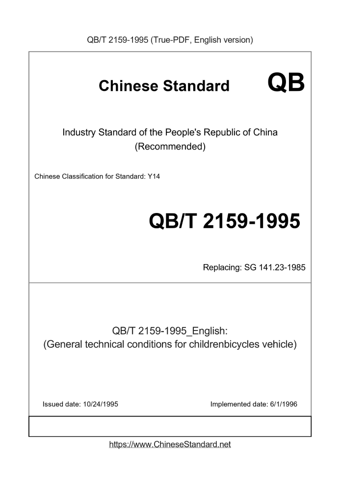Delivery: <= 2 days. True-PDF full-copy in English will be manually translated and delivered via email. QB/T 2159-1995: (General technical conditions for childrenbicycles vehicle) Status: Obsolete