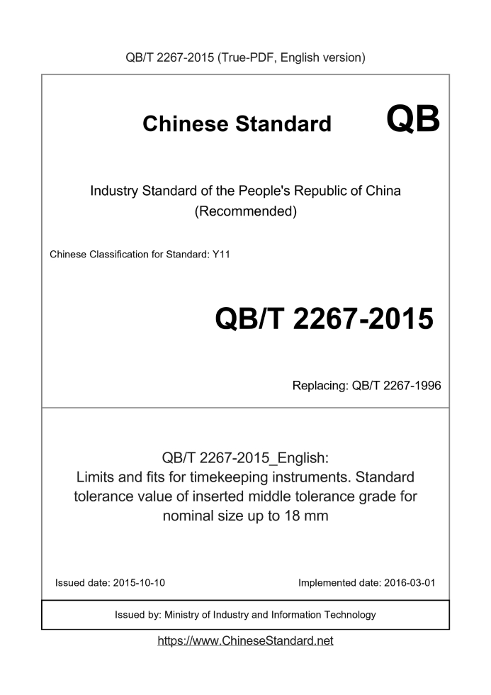 Delivery: <= 3 days. True-PDF full-copy in English will be manually translated and delivered via email. QB/T 2267-2015: Limits and fits for timekeeping instruments. Standard tolerance value of inserted middle tolerance grade for nominal size up to 18 mm Status: Valid QB/T 2267: Historical versions