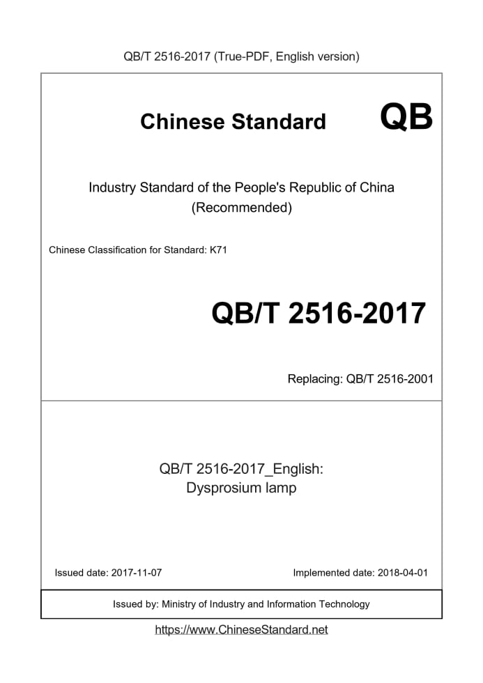 Delivery: <= 3 days. True-PDF full-copy in English will be manually translated and delivered via email. QB/T 2516-2017: Dysprosium lamp Status: Valid QB/T 2516: Historical versions