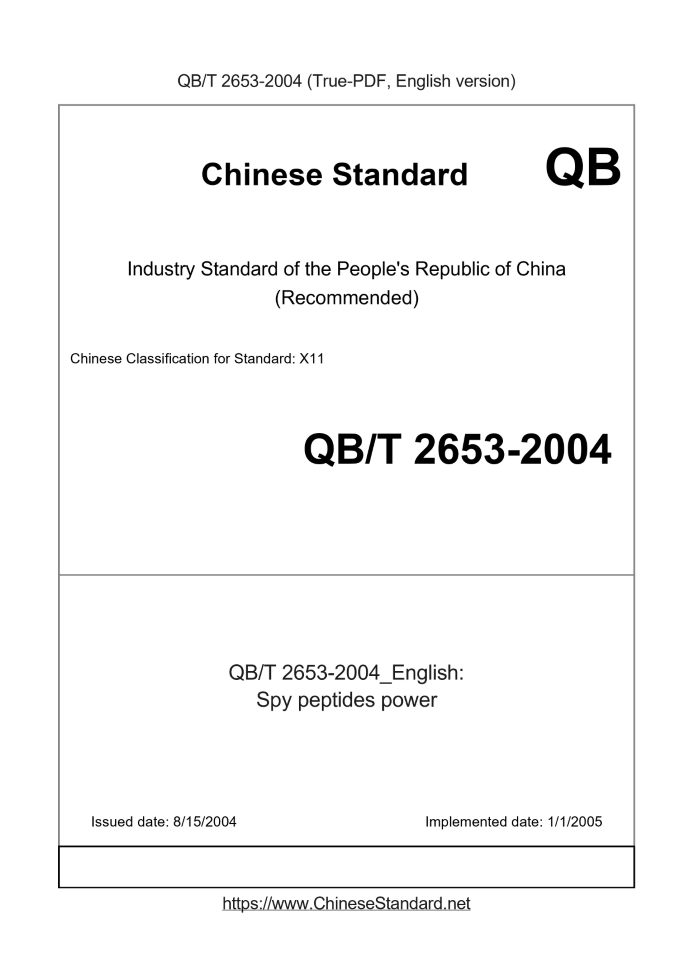 | QB/T 2653-2004 | English | 359 | Add to Cart | 3 days [Need to translate] | Spy peptides power |