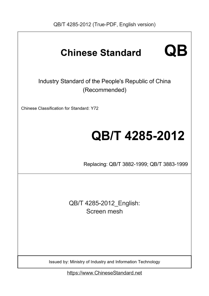 Delivery: <= 3 days. True-PDF full-copy in English will be manually translated and delivered via email. QB/T 4285-2012: Screen mesh Status: Valid