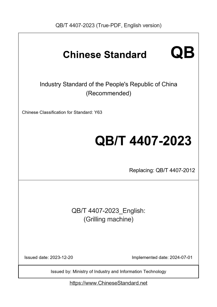 Delivery: <= 3 days. True-PDF full-copy in English will be manually translated and delivered via email. QB/T 4407-2023: (Grilling machine) Status: Valid QB/T 4407: Historical versions