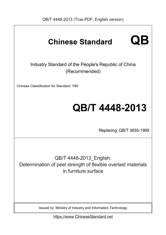 Delivery: <= 3 days. True-PDF full-copy in English will be manually translated and delivered via email. QB/T 4448-2013: Determination of peel strength of flexible overlaid materials in furniture surface Status: Valid