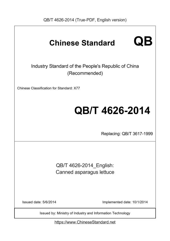 Delivery: <= 3 days. True-PDF full-copy in English will be manually translated and delivered via email. QB/T 4626-2014: Canned asparagus lettuce Status: Valid