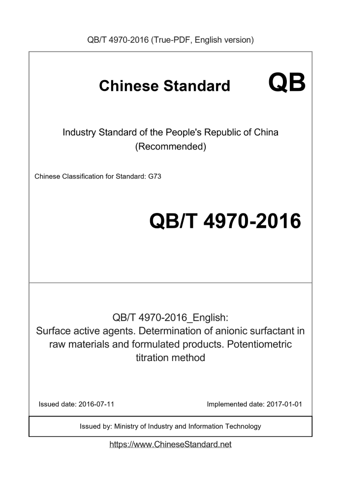 Basic dataStandard ID: QB/T 4970-2016 (QB/T4970-2016)Description (Translated English): Surface active agents. Determination of anionic surfactant in raw materials and formulated products. Potentiometric titration method Sector / Industry: Light Industry Standard (Recommended) Classification of Chinese Standard: G73 Word Count Estimation: 8,848 Date of Issue: 2016-07-11 Date of Implementation: 2017-01-01 Regulation (derived from): Ministry of Industry and Information Technology (2016 No. 37); Industry Standard Record Announcement 2016 No. 9 (Total No. 201) Issuing agency(ies): Ministry of Industry and Information Technology Summary: This standard specifies potentiometric titration of anionic surfactants in the preparation of surfactant raw materials and formulated products. When the analysis results are expressed in mass fraction, the average relative molecular mass of the anionic surfactant is known or measured in advance. This standard does not apply to the determination of the presence of cationic surfactants. Note 1: Urea, ethylenediaminetetraacetate and sodium carboxymethylcellulose do not interfere. Note 2: When nonionic surfactants are present, their effects are estimated according to each special case. Note 3: Typical inorganic components in detergent formulations, such as sodium chloride, sodium sulfate, sodium borate, sodium tripolyphosphate, sodium perborate, sodium silicate, etc., do not interfere, but bleaching agents other than sodium perborate are analyzed It should be destroyed before, and the sample should be completely soluble in water. Tips & Frequently Asked Questions:Question 1: How long will the true-PDF of QB/T 4970-2016_English be delivered?Answer: Upon your order, we will start to translate QB/T 4970-2016_English as soon as possible, and keep you informed of the progress. The lead time is typically in 9 seconds (download/delivered in 9 seconds). The lengthier the document the longer the lead time.Question 2: Can I share the purchased PDF of QB/T 4970-2016_English with my colleagues?Answer: Yes. The purchased PDF of QB/T 4970-2016_English will be deemed to be sold to your employer/organization who actually pays for it, including your colleagues and your employer's intranet.Question 3: Does the price include tax/VAT?Answer: Yes. Our tax invoice, downloaded/delivered in 9 seconds, includes all tax/VAT and complies with 100+ countries' tax regulations (tax exempted in 100+ countries) -- See Avoidance of Double Taxation Agreements (DTAs): List of DTAs signed between Singapore and 100+ countriesQuestion 4: Do you accept my currency other than USD?Answer: Yes. If you need your currency to be printed on the invoice, please write an email to Sales@ChineseStandard.net. In 2 working-hours, we will create a special link for you to pay in any currencies. Otherwise, follow the normal steps: Add to Cart -- Checkout -- Select your currency to pay. |