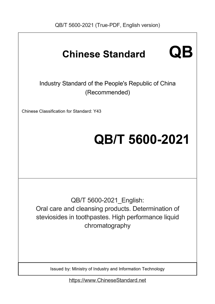 Delivery: <= 3 days. True-PDF full-copy in English will be manually translated and delivered via email. QB/T 5600-2021: Oral care and cleansing products. Determination of steviosides in toothpastes. High performance liquid chromatography Status: Valid