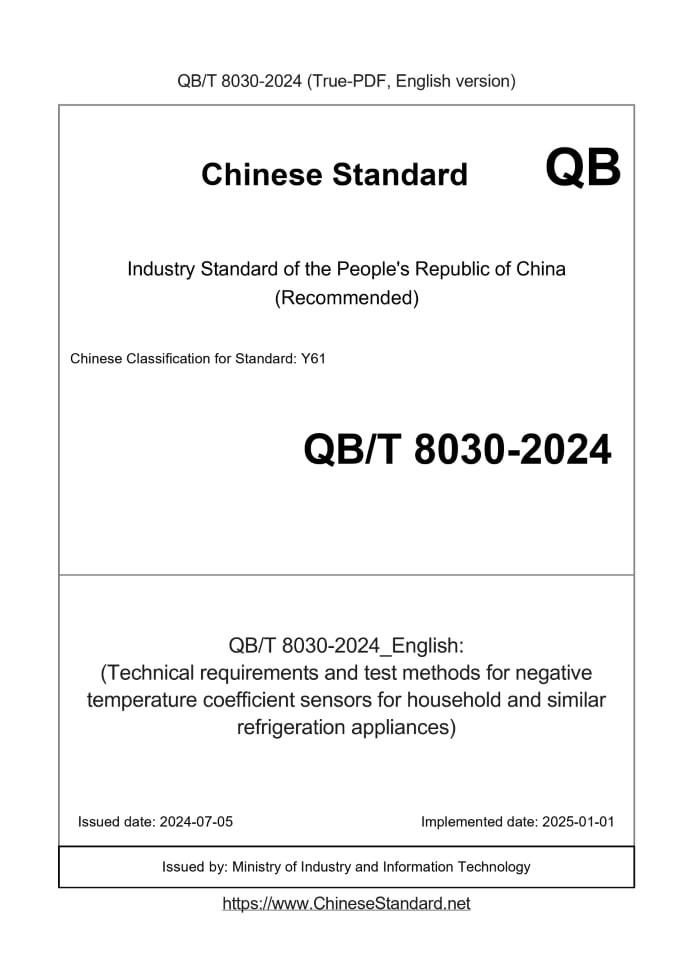Delivery: <= 4 days. True-PDF full-copy in English will be manually translated and delivered via email. QB/T 8030-2024: (Technical requirements and test methods for negative temperature coefficient sensors for household and similar refrigeration appliances) Status: Valid