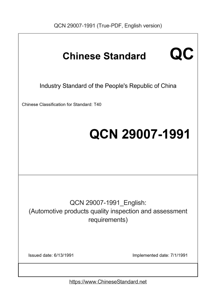 Delivery: <= 4 days. True-PDF full-copy in English will be manually translated and delivered via email. QCN29007-1991: (Automotive products quality inspection and assessment requirements) Status: Obsolete