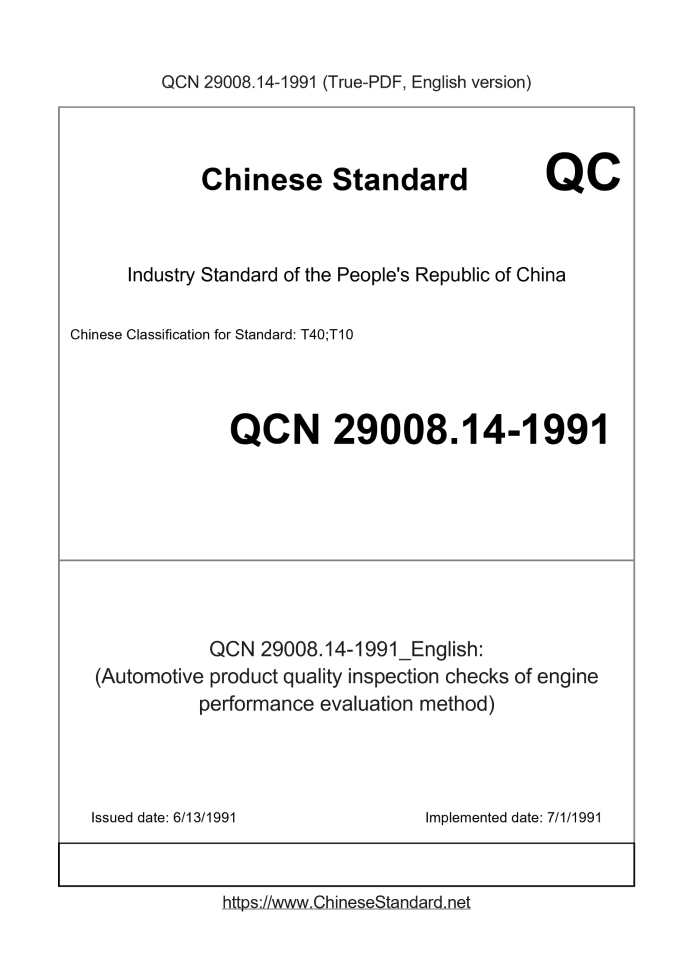 Delivery: <= 2 days. True-PDF full-copy in English will be manually translated and delivered via email. QCN29008.14-1991: (Automotive product quality inspection checks of engine performance evaluation method) Status: Obsolete