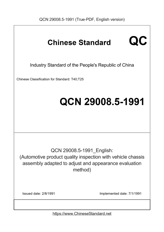 Delivery: <= 5 days. True-PDF full-copy in English will be manually translated and delivered via email. QCN29008.5-1991: (Automotive product quality inspection with vehicle chassis assembly adapted to adjust and appearance evaluation method) Status: Obsolete