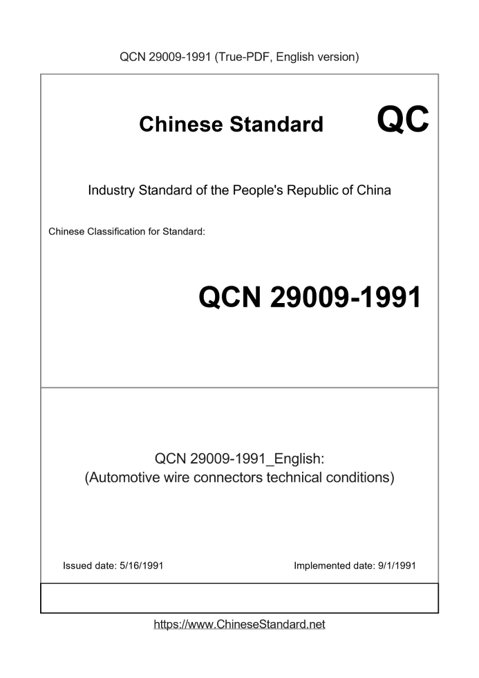 Delivery: <= 3 days. True-PDF full-copy in English will be manually translated and delivered via email. QCN29009-1991: (Automotive wire connectors technical conditions) Status: Obsolete