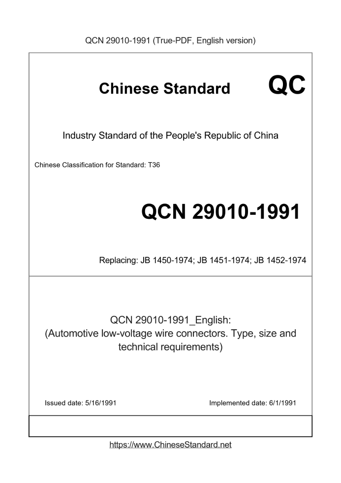 Delivery: <= 3 days. True-PDF full-copy in English will be manually translated and delivered via email. QCN29010-1991: (Automotive low-voltage wire connectors. Type, size and technical requirements) Status: Obsolete