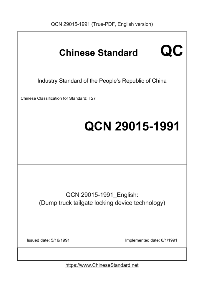 Delivery: <= 3 days. True-PDF full-copy in English will be manually translated and delivered via email. QCN29015-1991: (Dump truck tailgate locking device technology) Status: Obsolete