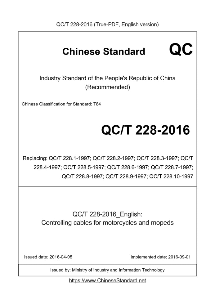 Delivery: <= 7 days. True-PDF full-copy in English will be manually translated and delivered via email. QC/T 228-2016: Controlling cables for motorcycles and mopeds Status: Valid QC/T 228: Historical versions