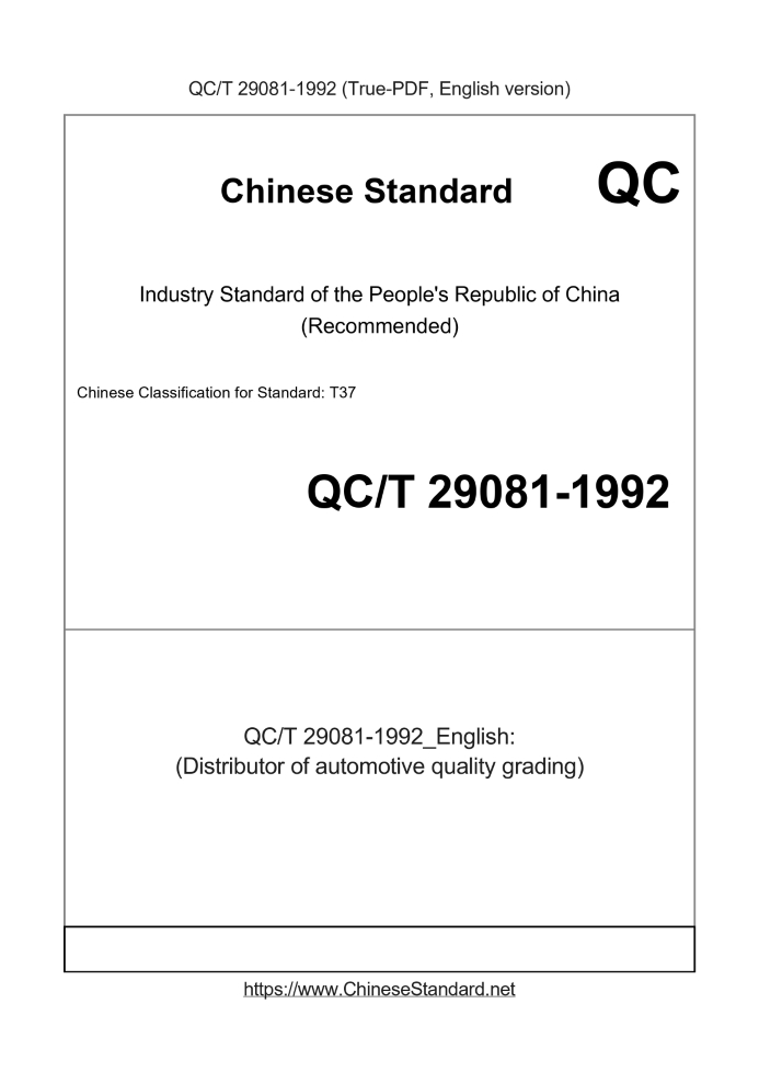 Delivery: <= 2 days. True-PDF full-copy in English will be manually translated and delivered via email. QC/T 29081-1992: (Distributor of automotive quality grading) Status: Obsolete