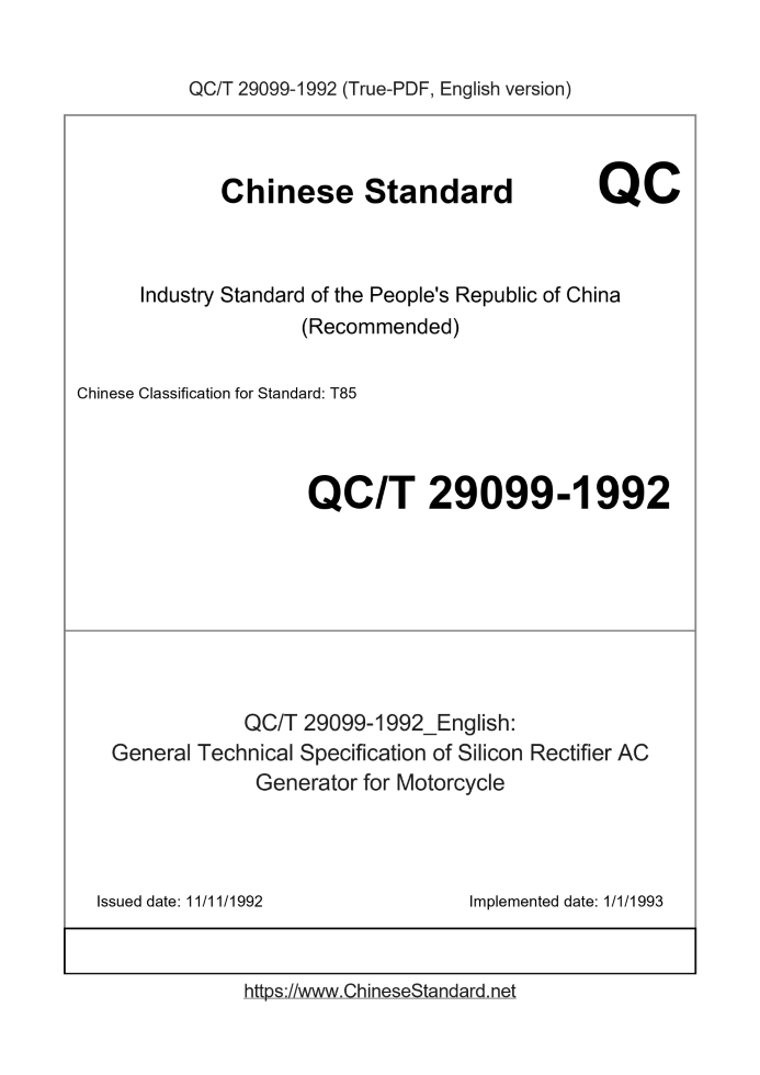 Delivery: <= 3 days. True-PDF full-copy in English will be manually translated and delivered via email. QC/T 29099-1992: General Technical Specification of Silicon Rectifier AC Generator for Motorcycle Status: Obsolete
