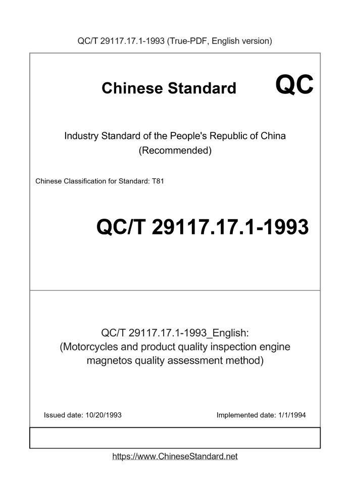 Delivery: <= 3 days. True-PDF full-copy in English will be manually translated and delivered via email. QC/T 29117.17.1-1993: (Motorcycles and product quality inspection engine magnetos quality assessment method) Status: Obsolete QC/T 29117.17.1: Historical versions