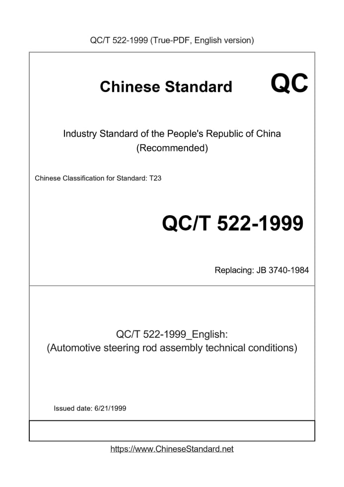 Delivery: <= 3 days. True-PDF full-copy in English will be manually translated and delivered via email. QC/T 522-1999: (Automotive steering rod assembly technical conditions) Status: Obsolete