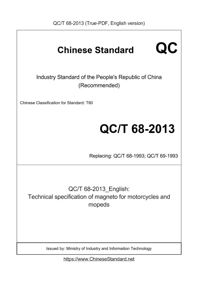 Delivery: <= 5 days. True-PDF full-copy in English will be manually translated and delivered via email. QC/T 68-2013: Technical specification of magneto for motorcycles and mopeds Status: Valid QC/T 68: Historical versions