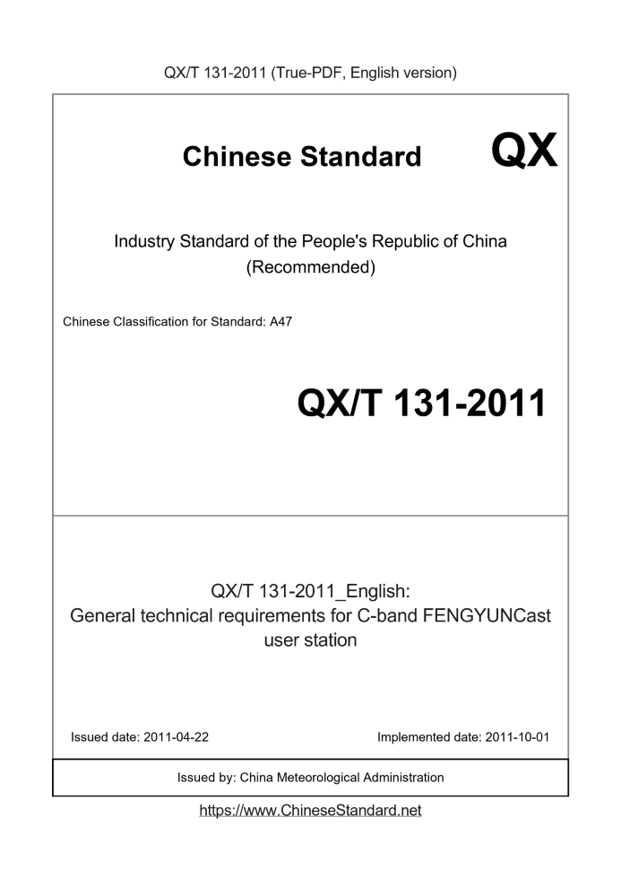 Basic dataStandard ID: QX/T 131-2011 (QX/T131-2011)Description (Translated English): General technical requirements for C-band FENGYUNCast user station Sector / Industry: Chinese Industry Standard (Recommended) Classification of Chinese Standard: A47 Word Count Estimation: 16,172 Date of Issue: 2011-04-22 Date of Implementation: 2011-10-01 Quoted Standard: GB/T 8898-2001; GB/T 11298.1-1997; GB/T 11298.2-1997; GB/T 11298.3-1997; GB/T 11298.4-1997; GB/T 11442-1995; SJ/T 11334-2006 Regulation (derived from): 2012 No. 12 (No. 156 overall) industry standard filing notice Issuing agency(ies): China Meteorological Administration Summary: This standard specifies the equipment composition, technical requirements, test methods and inspection rules of the C-band FENGYUNCast subscriber station, and establishes the user station hardware and software. This standard applies to the C-band FENGYUNCast user station design integration, installation commissioning, inspection and operation and maintenance. Tips & Frequently Asked Questions:Question 1: How long will the true-PDF of QXT131-2011_English be delivered?Answer: Upon your order, we will start to translate QXT131-2011_English as soon as possible, and keep you informed of the progress. The lead time is typically in 9 seconds (download/delivered in 9 seconds). The lengthier the document the longer the lead time.Question 2: Can I share the purchased PDF of QXT131-2011_English with my colleagues?Answer: Yes. The purchased PDF of QXT131-2011_English will be deemed to be sold to your employer/organization who actually pays for it, including your colleagues and your employer's intranet.Question 3: Does the price include tax/VAT?Answer: Yes. Our tax invoice, downloaded/delivered in 9 seconds, includes all tax/VAT and complies with 100+ countries' tax regulations (tax exempted in 100+ countries) -- See Avoidance of Double Taxation Agreements (DTAs): List of DTAs signed between Singapore and 100+ countriesQuestion 4: Do you accept my currency other than USD?Answer: Yes. If you need your currency to be printed on the invoice, please write an email to Sales@ChineseStandard.net. In 2 working-hours, we will create a special link for you to pay in any currencies. Otherwise, follow the normal steps: Add to Cart -- Checkout -- Select your currency to pay. |