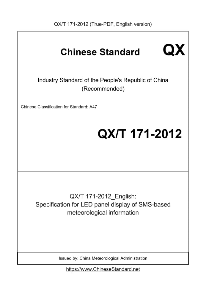 Delivery: <= 4 days. True-PDF full-copy in English will be manually translated and delivered via email. QXT171-2012: Specification for LED panel display of SMS-based meteorological information Status: Valid