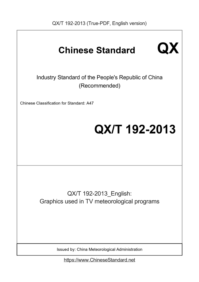 Delivery: <= 3 days. True-PDF full-copy in English will be manually translated and delivered via email. QXT192-2013: Graphics used in TV meteorological programs Status: Valid