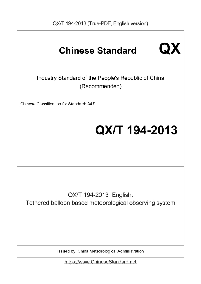 Delivery: <= 3 days. True-PDF full-copy in English will be manually translated and delivered via email. QXT194-2013: Tethered balloon based meteorological observing system Status: Valid