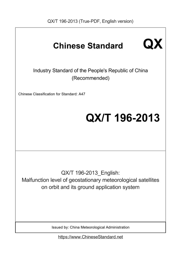 Delivery: <= 3 days. True-PDF full-copy in English will be manually translated and delivered via email. QXT196-2013: Malfunction level of geostationary meteorological satellites on orbit and its ground application system Status: Valid