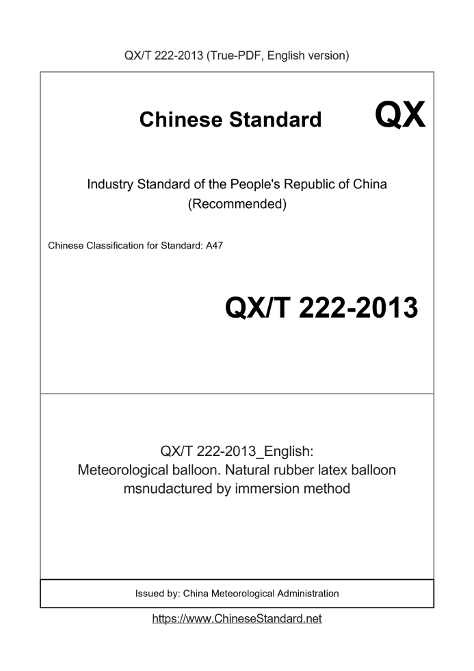 Delivery: <= 5 days. True-PDF full-copy in English will be manually translated and delivered via email. QXT222-2013: Meteorological balloon. Natural rubber latex balloon msnudactured by immersion method Status: Valid