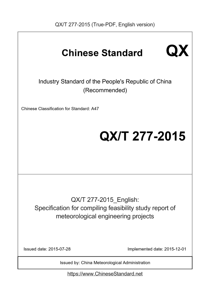 Delivery: <= 4 days. True-PDF full-copy in English will be manually translated and delivered via email. QXT277-2015: Specification for compiling feasibility study report of meteorological engineering projects Status: Valid