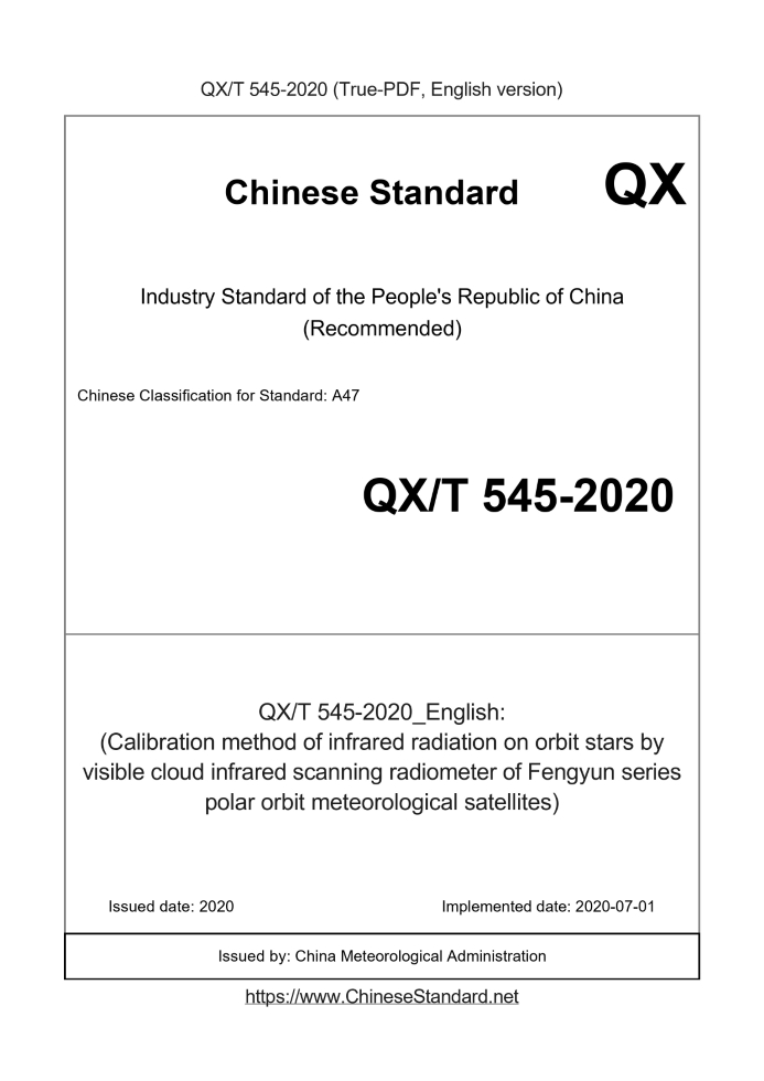 Delivery: <= 3 days. True-PDF full-copy in English will be manually translated and delivered via email. QXT545-2020: (Calibration method of infrared radiation on orbit stars by visible cloud infrared scanning radiometer of Fengyun series polar orbit meteorological satellites) Status: Valid