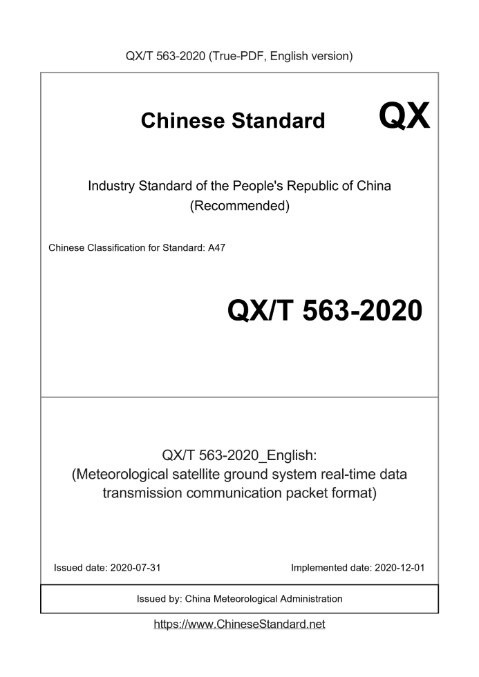 Delivery: <= 3 days. True-PDF full-copy in English will be manually translated and delivered via email. QXT563-2020: (Meteorological satellite ground system real-time data transmission communication packet format) Status: Valid