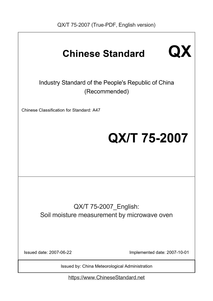 Delivery: <= 3 days. True-PDF full-copy in English will be manually translated and delivered via email. QXT75-2007: Soil moisture measurement by microwave oven Status: Valid